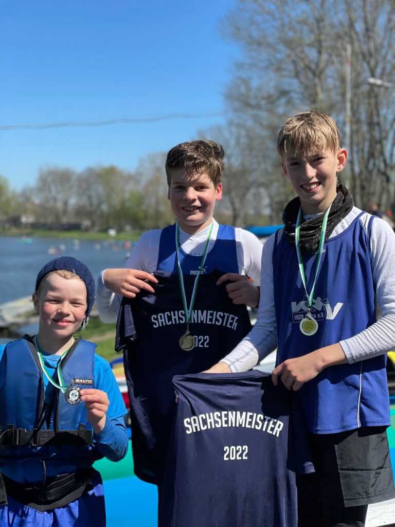 Zwei Altersklassen höher fuhr Jonas Dressler sowohl im K1, als auch mit seinem Zweierpartner, Ole Thalheim, zu Gold. Karl Fröhner darf sich nach zwei spektakulären Rennen im K1 und K2 Doppel-Vizesachsenmeister nennen. Bei den Herren Junioren erkämpften sich Tommy Lißner und Raik Große nach 6000m die Silbermedaille im Zweier.