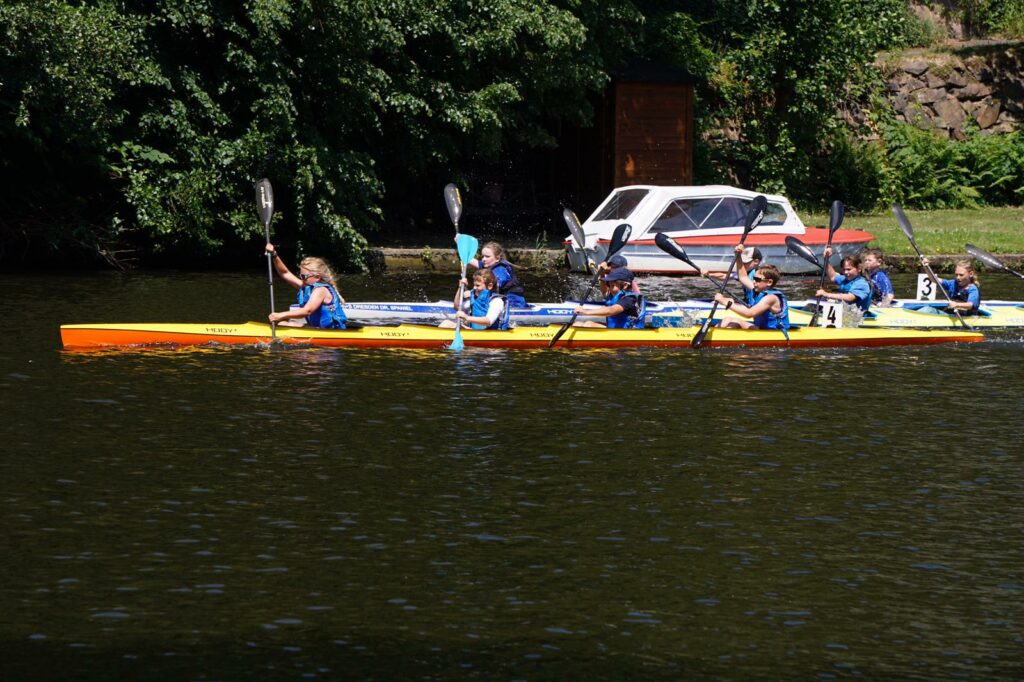 Eine Altersklasse höher, bei den Schülern B, konnten gleich zwölf Siege gefeiert werden. Jonas Dressler, Shania Richter, Luan Große und Karl Fröhner sprinteten im Einer als Erstes über die Ziellinie. Shania und Kim Naumann glänzten im K2 ebenso mit Gold. Genauso mit Ole Thalheim und Jonas im Mix K4. Im K4 und in der Staffel durften sich di