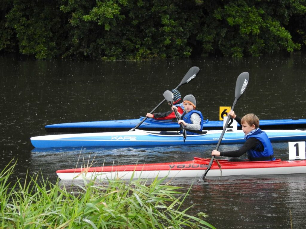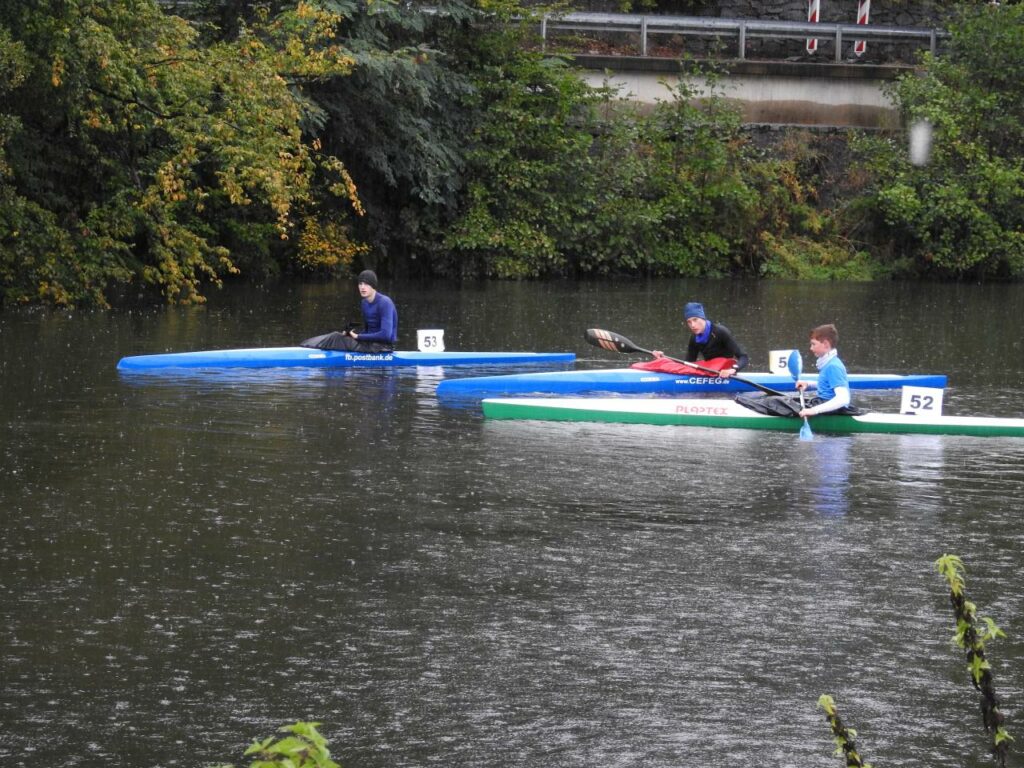 Trotz des Dauerregens waren alle hochmotiviert und paddelten so schnell es ging ins Ziel.